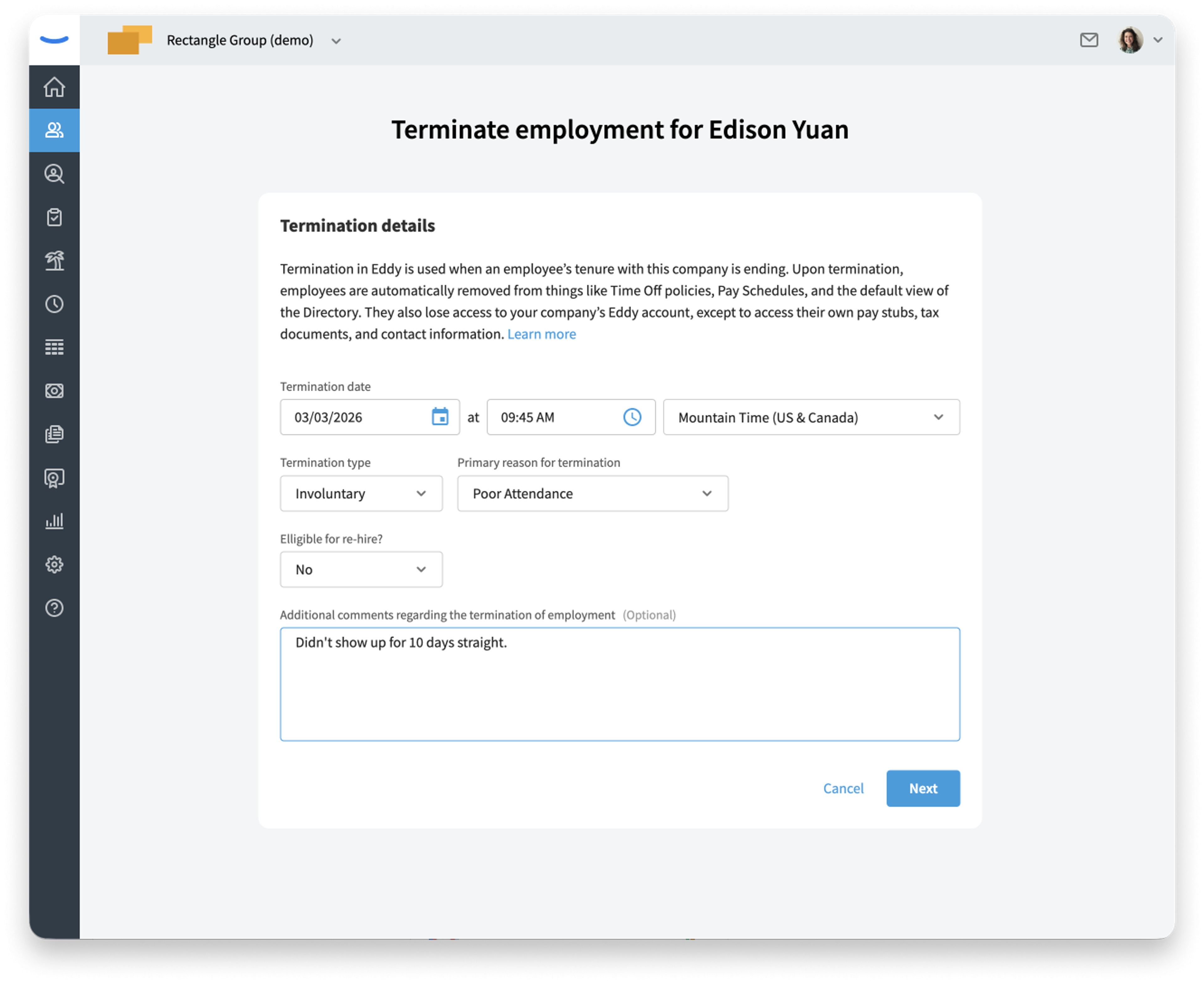This is an area where Eddy shines: it guides you step‑by‑step through the termination, syncs decisions into payroll, supports secure offboarding, and preserves an audit trail so you’re not relying on memory or sticky notes. That frees your limited HR and leadership bandwidth to focus on what only humans can do—communicate clearly, show respect, and help the rest of the team move forward.
