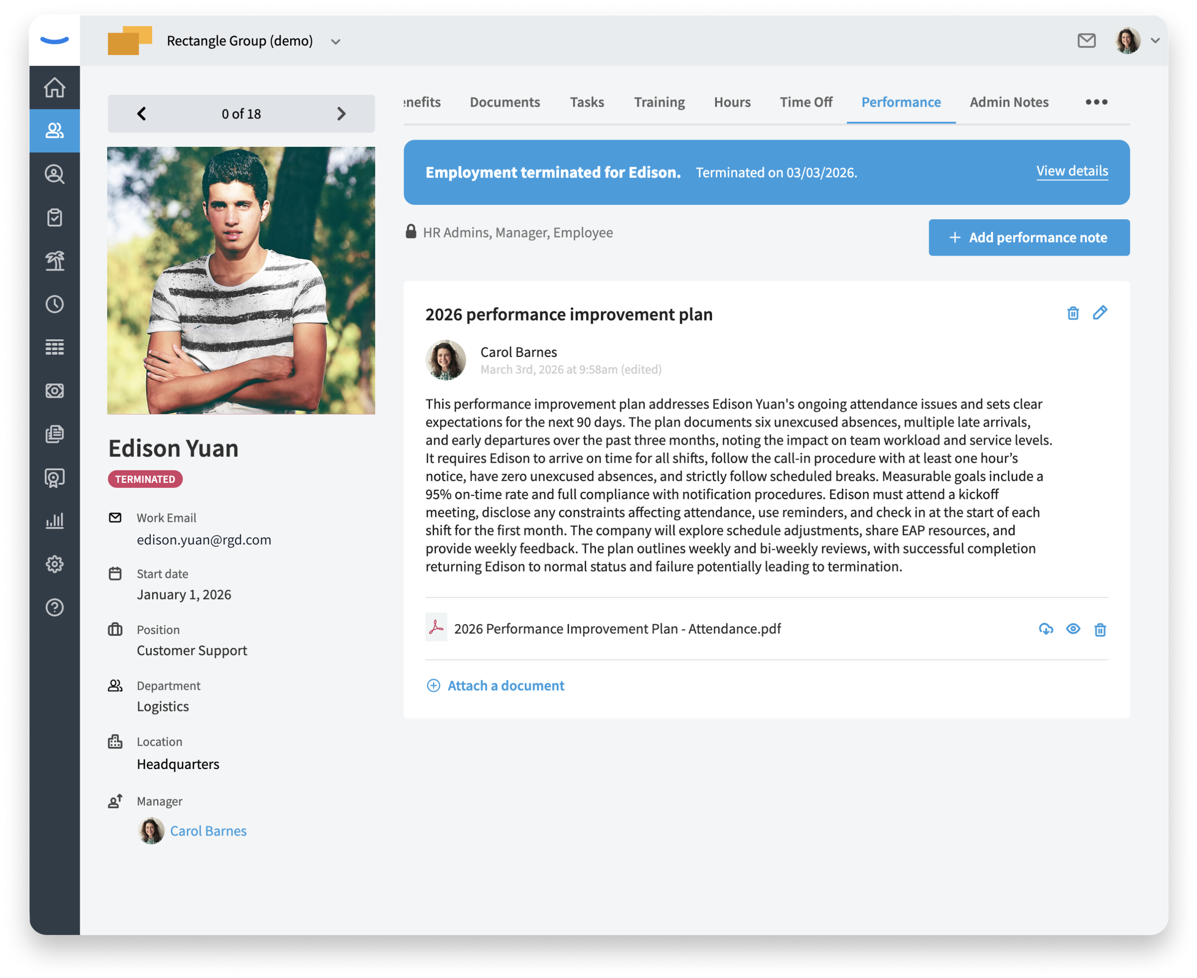 Start with clear, documented reasons for the decision tied to your policies, expectations, or business needs. Good documentation usually includes dates, examples, any prior coaching or warnings, and who was involved. In Eddy, this kind of history can live in the Performance area on the employee profile, where you can store written warnings, goals, 1:1 notes, and quarterly check‑ins in one place instead of scattered across email and shared drives. When it’s time to make or defend a termination decision, you have a chronological record that shows you treated the employee fairly and followed your own process.