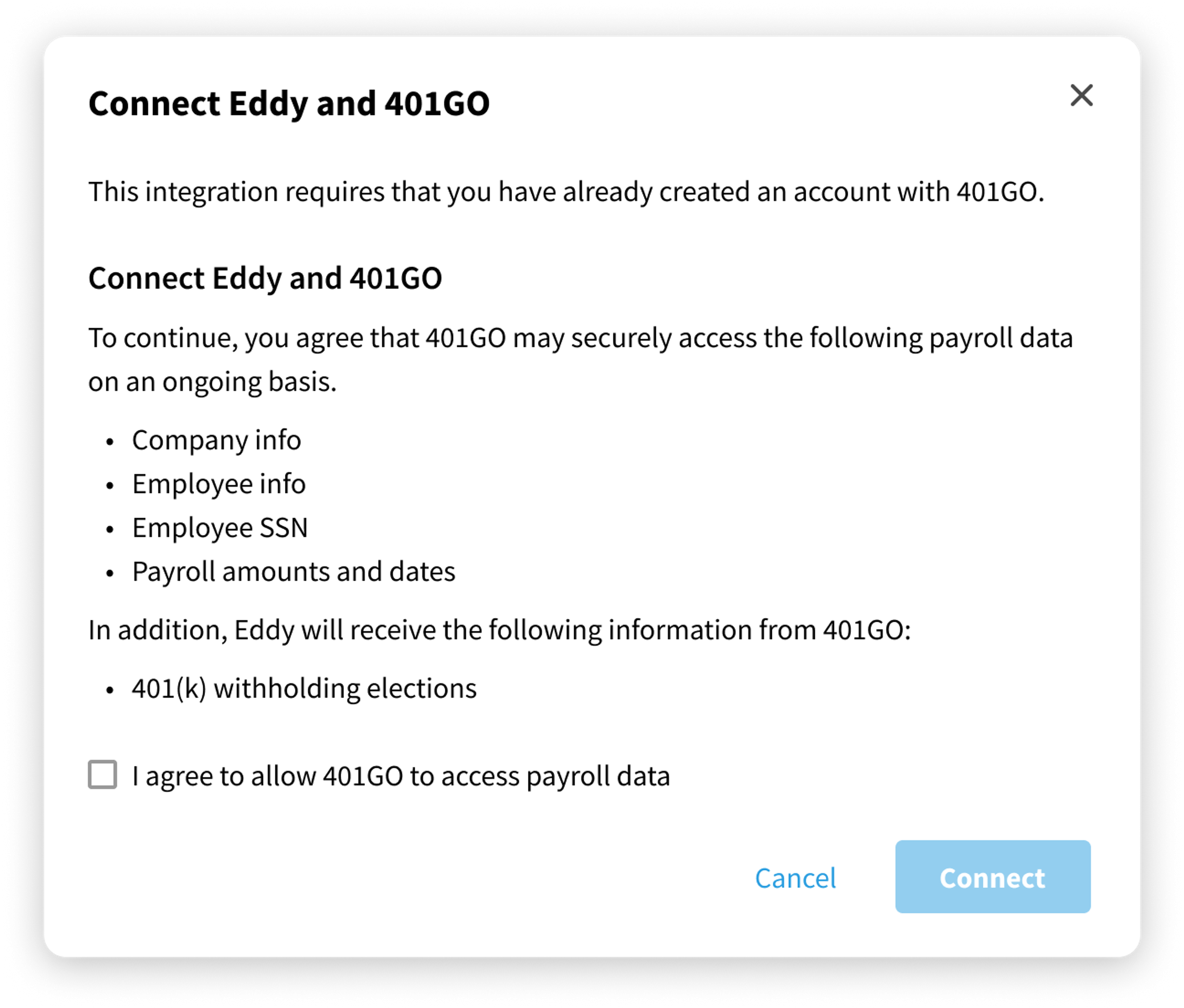 | Payroll Journal | Eddy to partner | Payroll data | Payroll information is required to comply with 401(k) regulations |