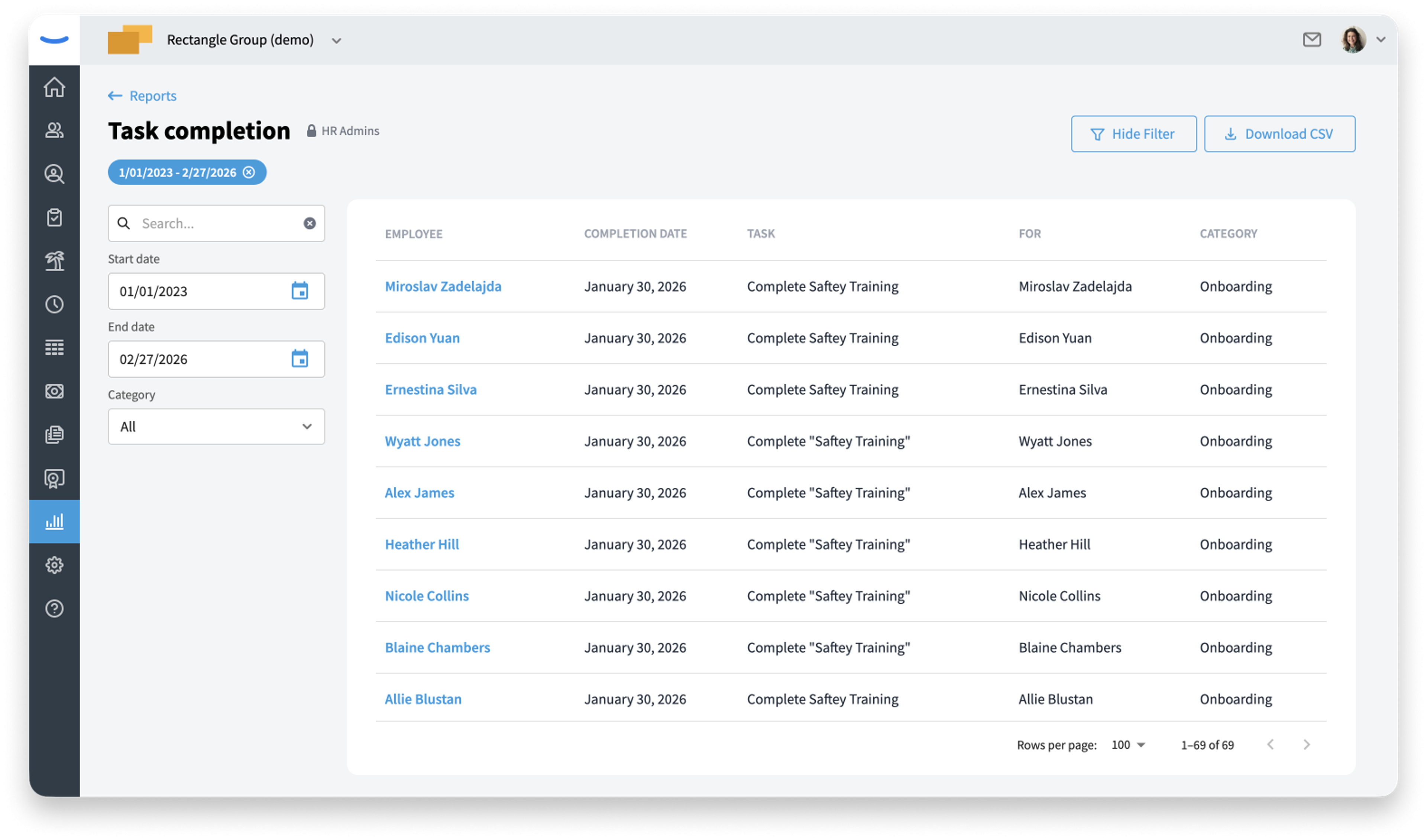 This report shows task completion details for all tasks. Users could filter by person, category (onboarding, offboarding, general), template name (from active task packet templates), assignee, and date ranges for precise insights.